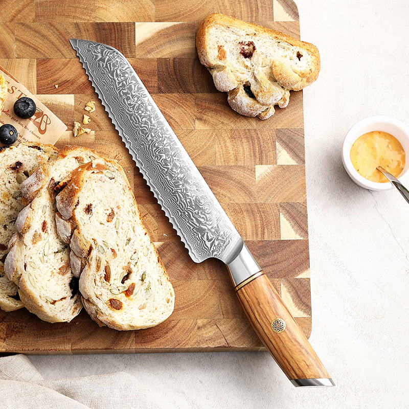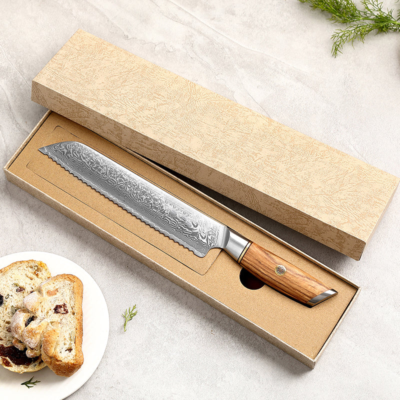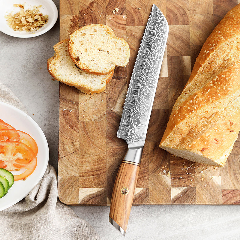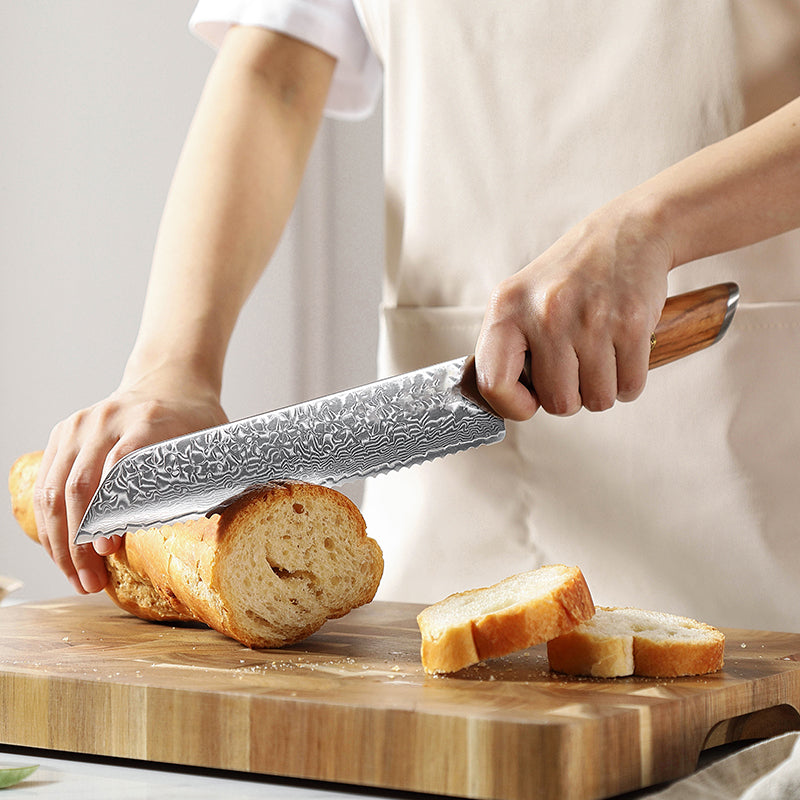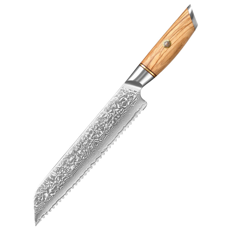 Dieses hochwertige Brotmesser vereint kraftvolle Funktionalität mit eleganter Optik: Die lange Klinge aus 73 Lagen Damaststahl durchtrennt mühelos Krustenbrot, Baguette oder weiche Brötchen – ganz ohne Reißen oder Quetschen. Die feine Wellenzahnung sorgt für saubere, präzise Schnitte bei jeder Art von Gebäck.