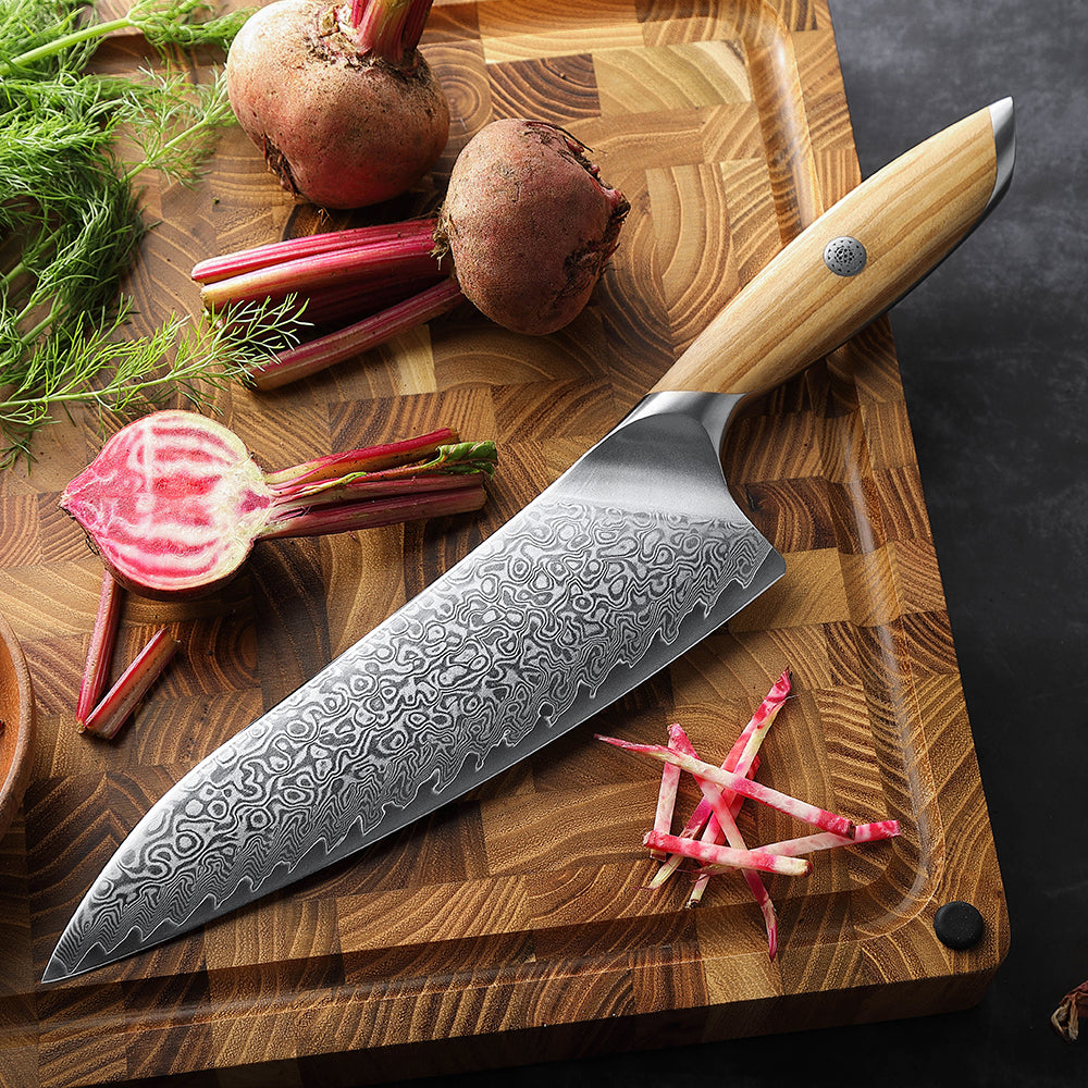 Dieses Chefmesser ist das Herzstück jeder ambitionierten Küche – geschmiedet aus 73 Lagen hochwertigem Damaststahl, überzeugt es durch enorme Schärfe, außergewöhnliche Stabilität und ein faszinierendes Klingenmuster, das jedes Messer zu einem echten Einzelstück macht.