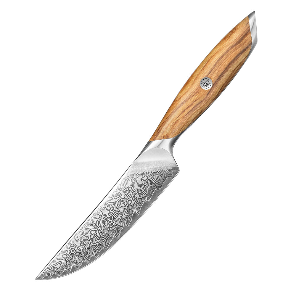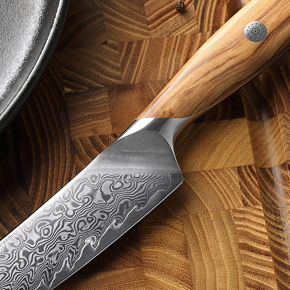 Der ergonomisch geformte Griff aus hochwertigem Olivenholz liegt angenehm in der Hand und rundet das Design mit seiner warmen, natürlichen Maserung stilvoll ab.
