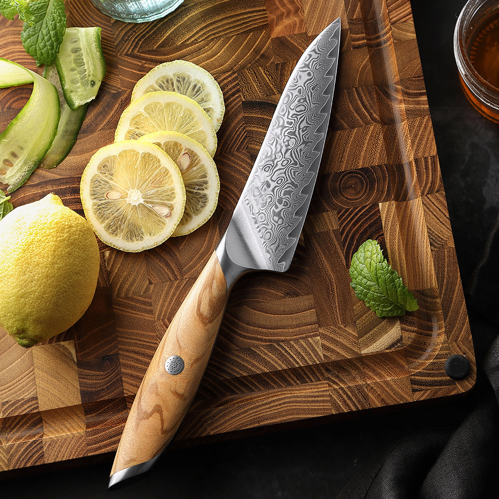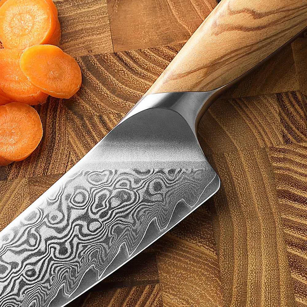 Die Klinge beeindruckt nicht nur durch ihre Schärfe, sondern auch durch ihr faszinierendes Damastmuster – jedes Exemplar ein echtes Unikat. Der ergonomische Griff aus wunderschön gemasertem Olivenholz liegt angenehm in der Hand und bringt mediterranen Charakter in deine Küche.