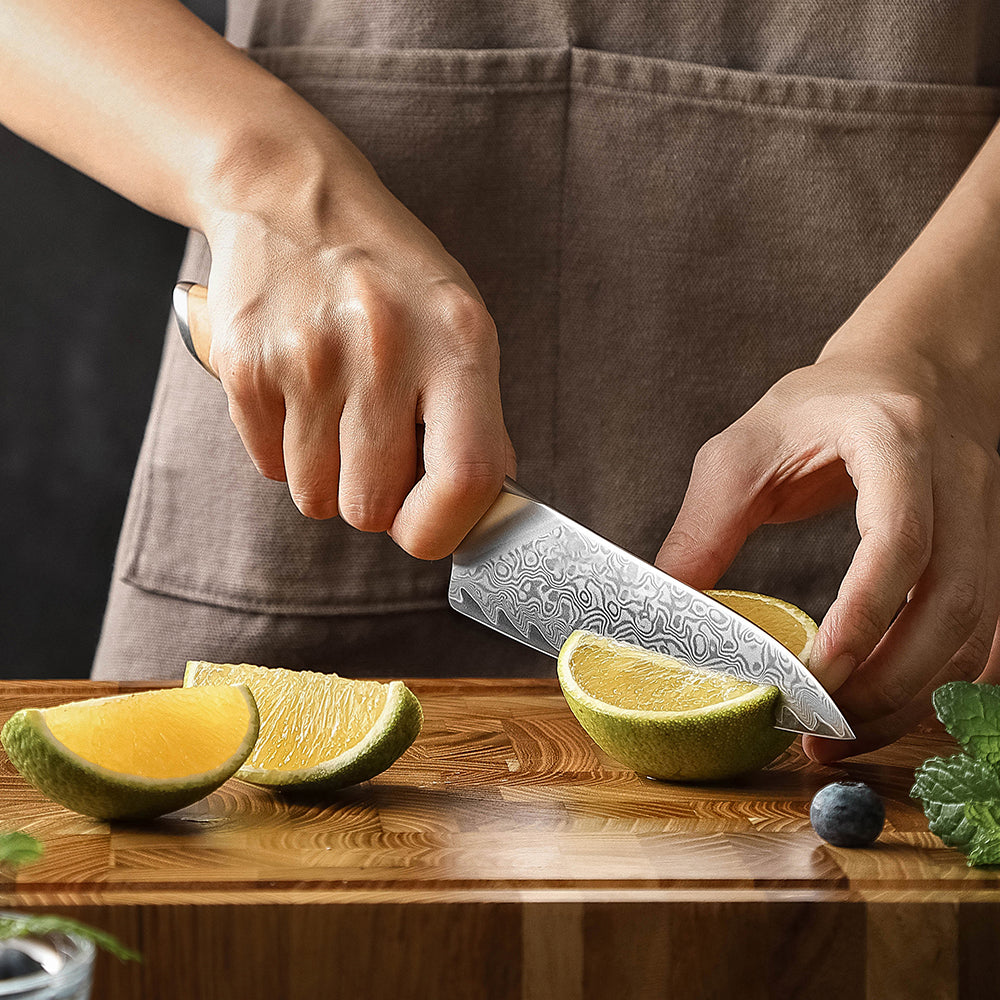 Klein, wendig und dennoch kraftvoll – dieses Utility-Messer aus 73 Lagen edlem Damaststahl ist der perfekte Begleiter für präzise Schneidarbeiten im Alltag. Ob Obst, Gemüse, Wurst oder kleinere Fleischstücke: Mit seiner feinen Spitze und scharfen Schneide gleitet es mühelos durch verschiedenste Zutaten.