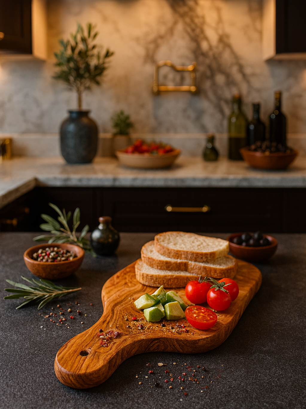 Die einzigartige Maserung des Olivenholzes verleiht jedem Brett seinen individuellen Charakter und mediterranen Charme. Robust, langlebig und gleichzeitig dekorativ – ein echter Allrounder für Küche und Esstisch.