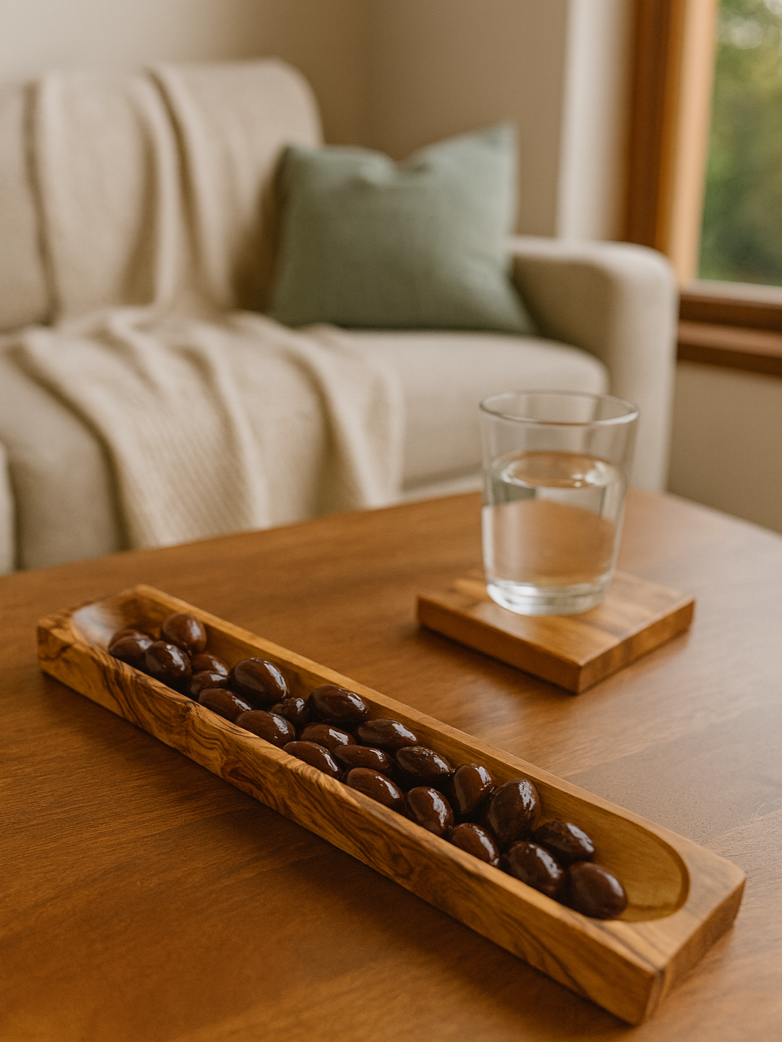 Diese elegante Tapasschale aus hochwertigem Olivenholz bringt mediterranes Flair direkt auf deinen Tisch. Perfekt geeignet für Oliven, Nüsse, Dips oder kleine Snacks – sie ist nicht nur praktisch, sondern auch ein echter Blickfang. Jedes Stück ist durch die einzigartige Maserung des Olivenholzes ein Unikat und sorgt für eine warme, natürliche Atmosphäre.