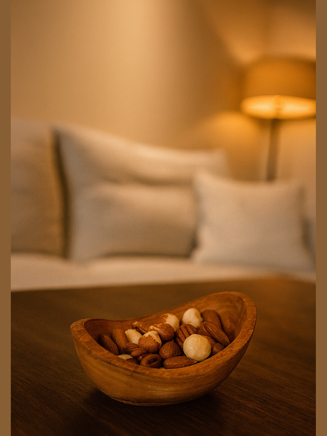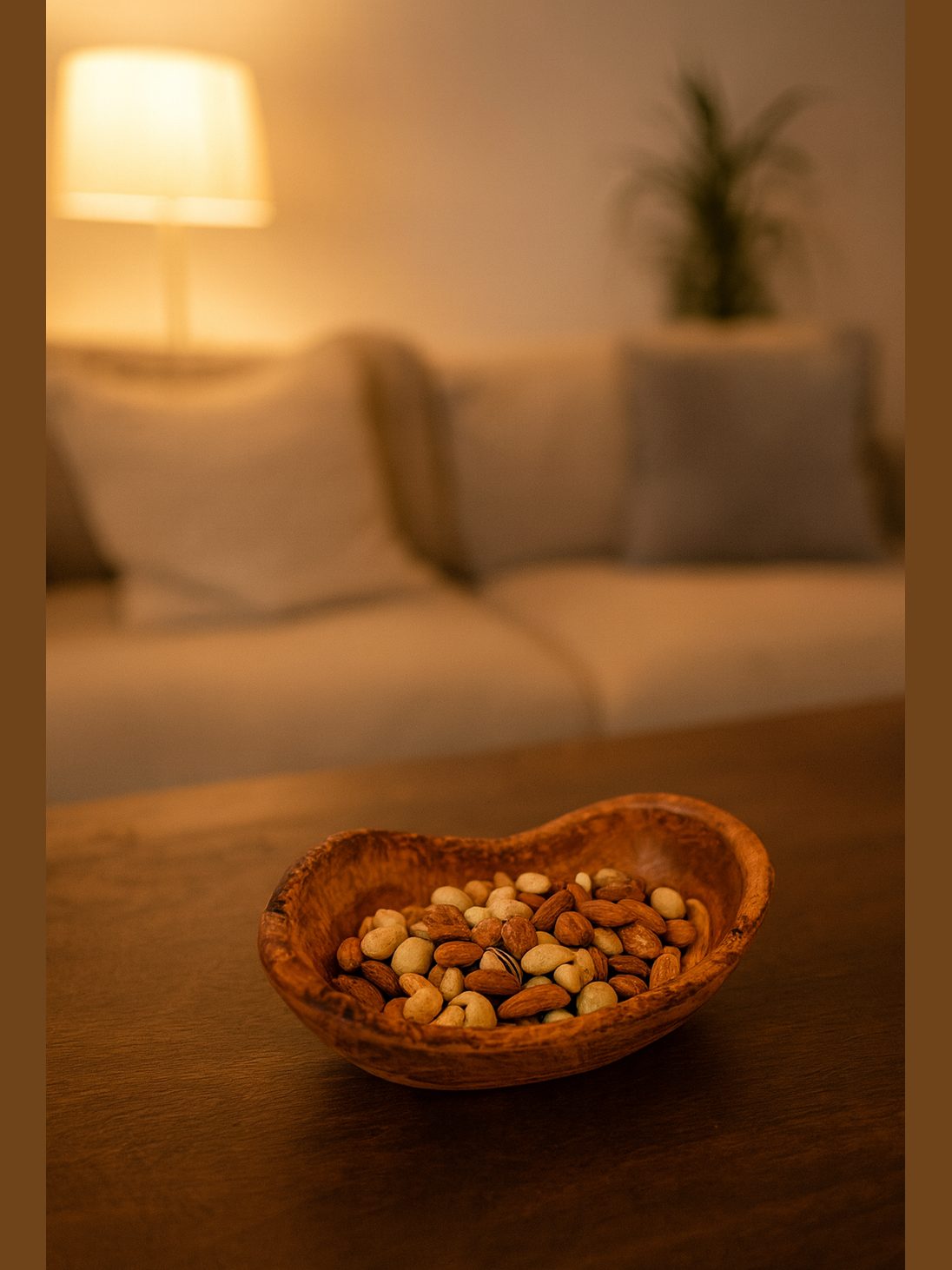Diese handgefertigte Schale aus massivem Olivenholz vereint mediterranen Charme mit einzigartiger Ursprünglichkeit. Die warme Maserung und die unregelmäßige Form machen jedes Stück zu einem echten Unikat – perfekt zum Servieren von Nüssen, Snacks, Dips oder kleinen Beilagen.
