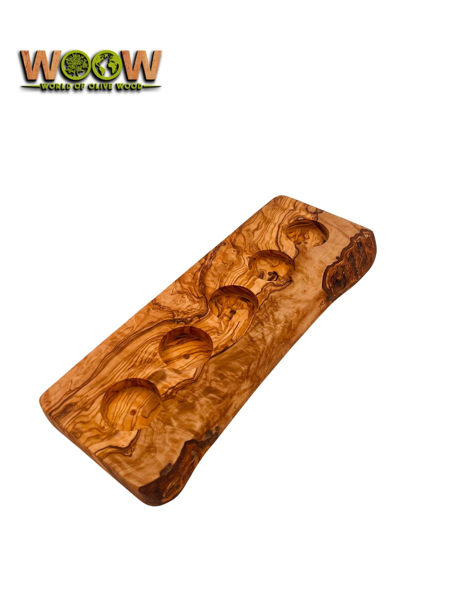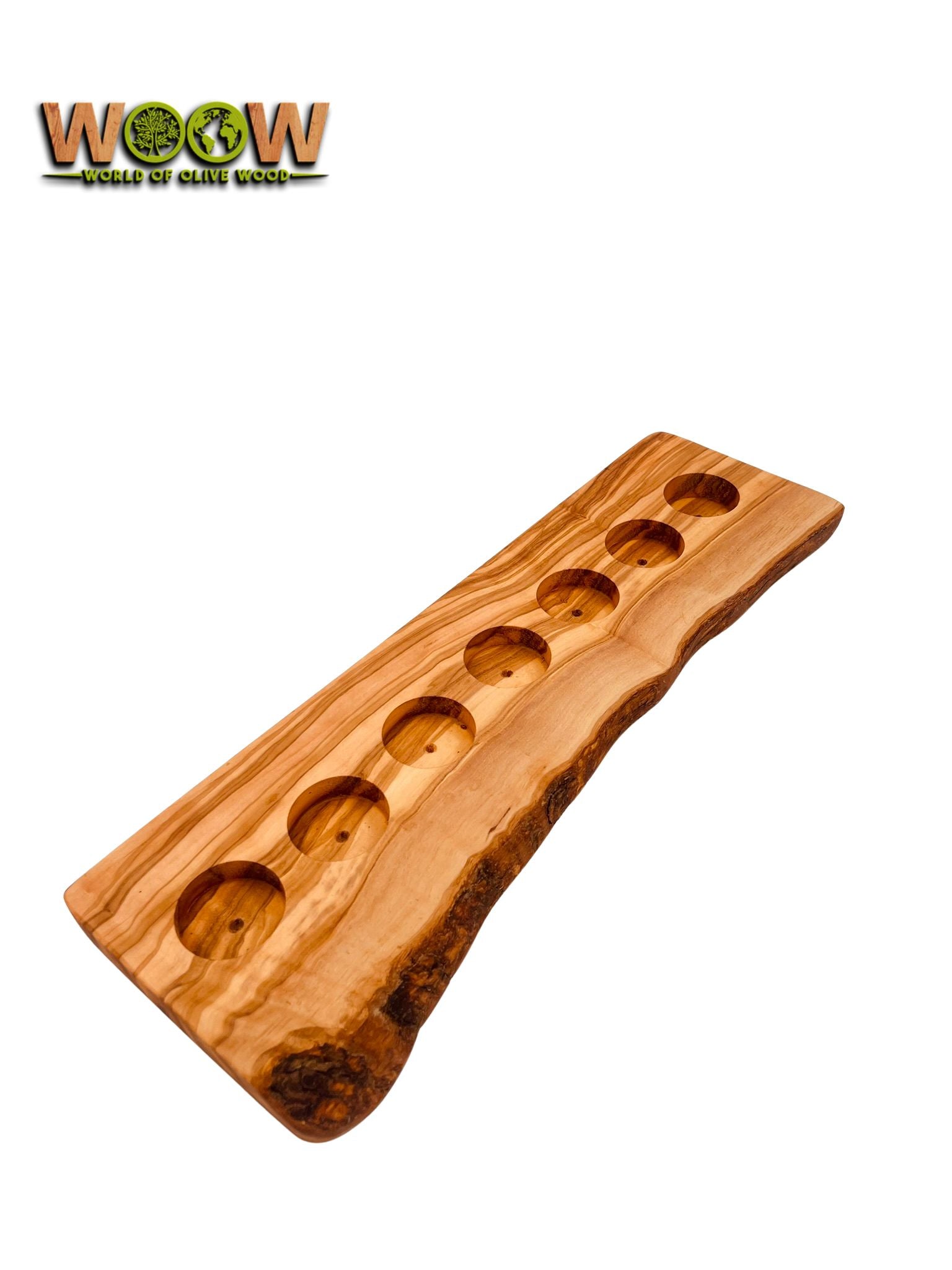 Sieben Flammen tanzen auf diesem edlen Stück Olivenholz – ideal für große Tafeln, festliche Dekorationen oder stimmungsvolle Abende. Die lebendige Maserung und die wilde Rindenkante verleihen ihm eine ganz besondere Ausstrahlung.