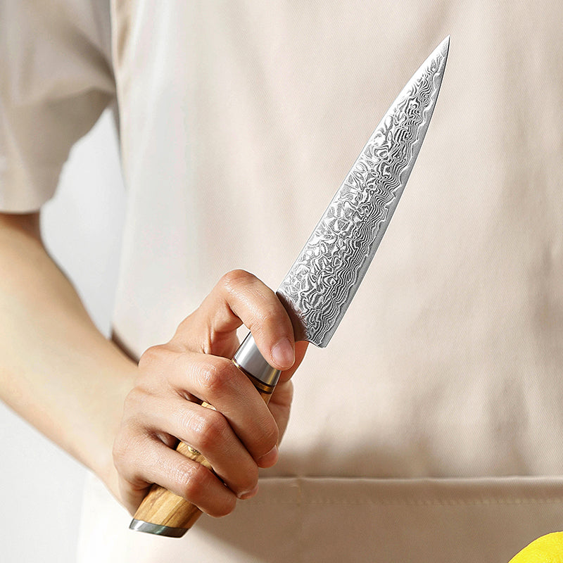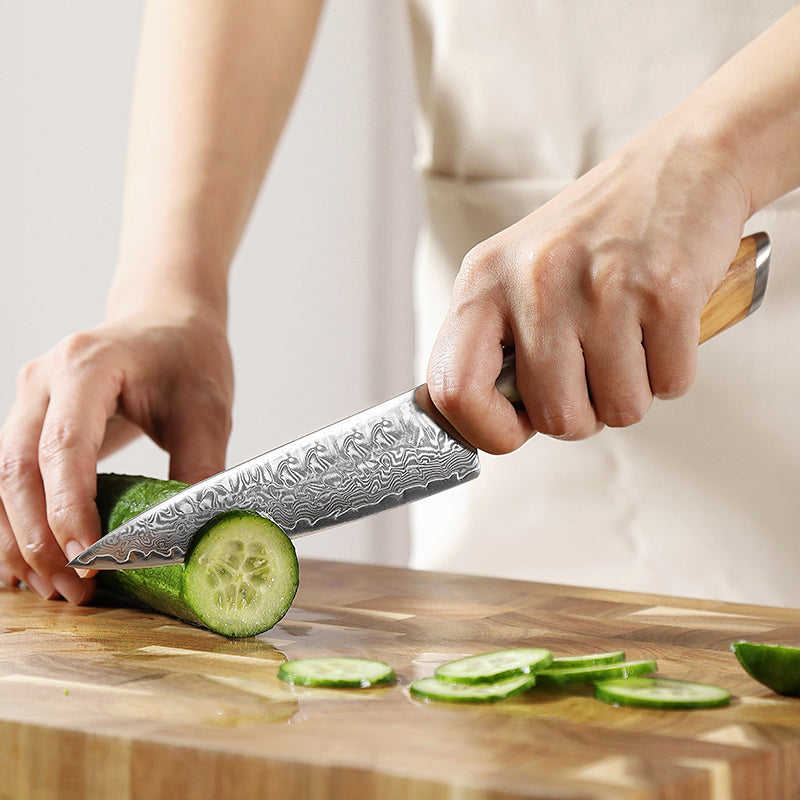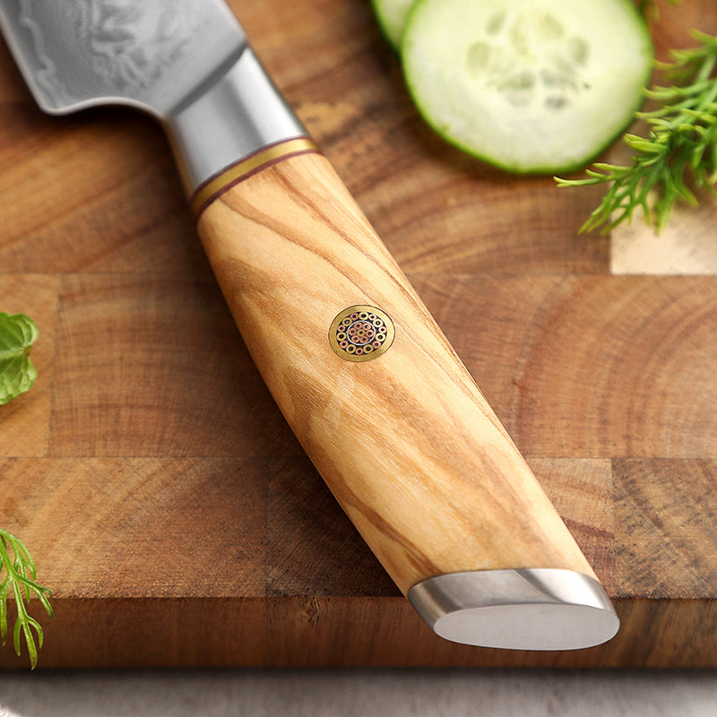 Die Klinge beeindruckt nicht nur durch ihre Schärfe, sondern auch durch ihr faszinierendes Damastmuster – jedes Exemplar ein echtes Unikat. Der ergonomische Griff aus wunderschön gemasertem Olivenholz liegt angenehm in der Hand und bringt mediterranen Charakter in deine Küche.