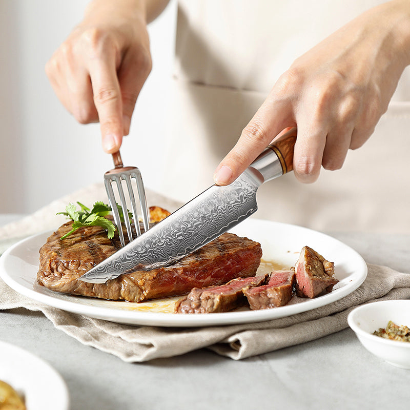 Dieses edle Steakmesser vereint höchste Handwerkskunst mit zeitloser Ästhetik: Die Klinge aus 73 Lagen feinster Damaststahl sorgt für extreme Schärfe, müheloses Gleiten durch jedes Steak und ein einzigartiges Muster, das jede Klinge zum Einzelstück macht.